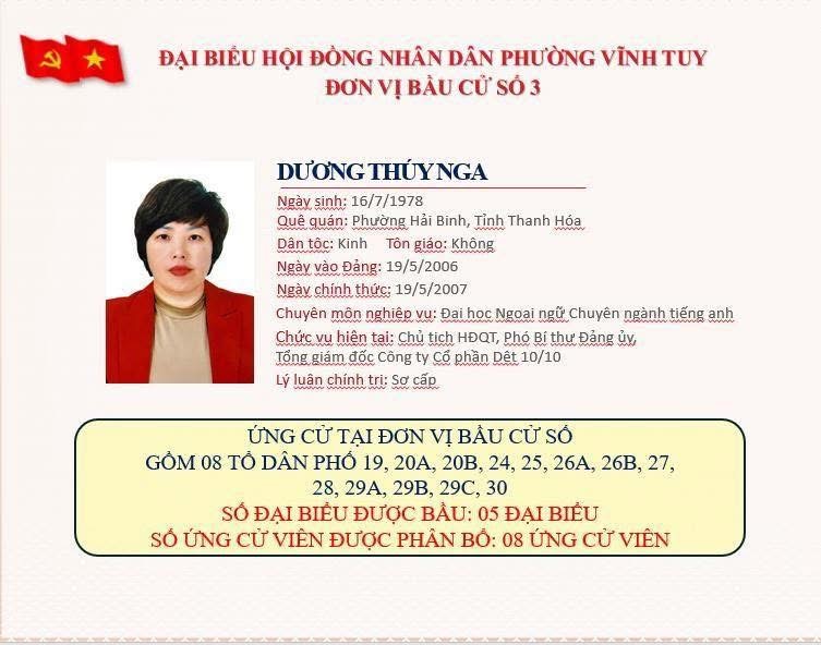 Hướng tới cuộc bầu cử đại biểu Hội đồng nhân dân các cấp nhiệm kỳ 2026 – 2031, bà Dương Thúy Nga vinh dự được giới thiệu ứng cử đại biểu Hội đồng nhân dân phường Vĩnh Tuy, thuộc thành phố Hà Nội, tại đơn vị bầu cử số 3.