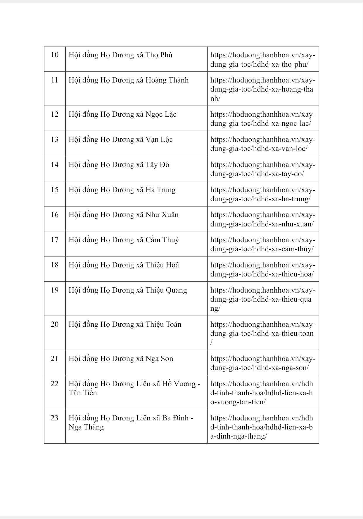 Ngày 09/12/2025, thay mặt Ban Thông tin Truyền thông Hội đồng Họ Dương tỉnh Thanh Hoá, ông Dương Văn Tùng – Uỷ viên Hội đồng Họ Dương tỉnh Thanh Hoá – Trưởng Ban Thông tin Truyền thông Hội đồng Họ Dương tỉnh Thanh Hoá, ký công văn số 12/TB-BTTTT về việc thông báo chuyển giao chuyên mục hoạt động Hội đồng Họ Dương cấp huyện (cũ) về chuyên mục Xây dựng Dòng tộc,và thành lập thực hiện chuyên mục hoạt động Hội đồng Họ Dương cấp xã, phường, liên xã, trực thuộc Hội đồng Họ Dương tỉnh Thanh Hoá