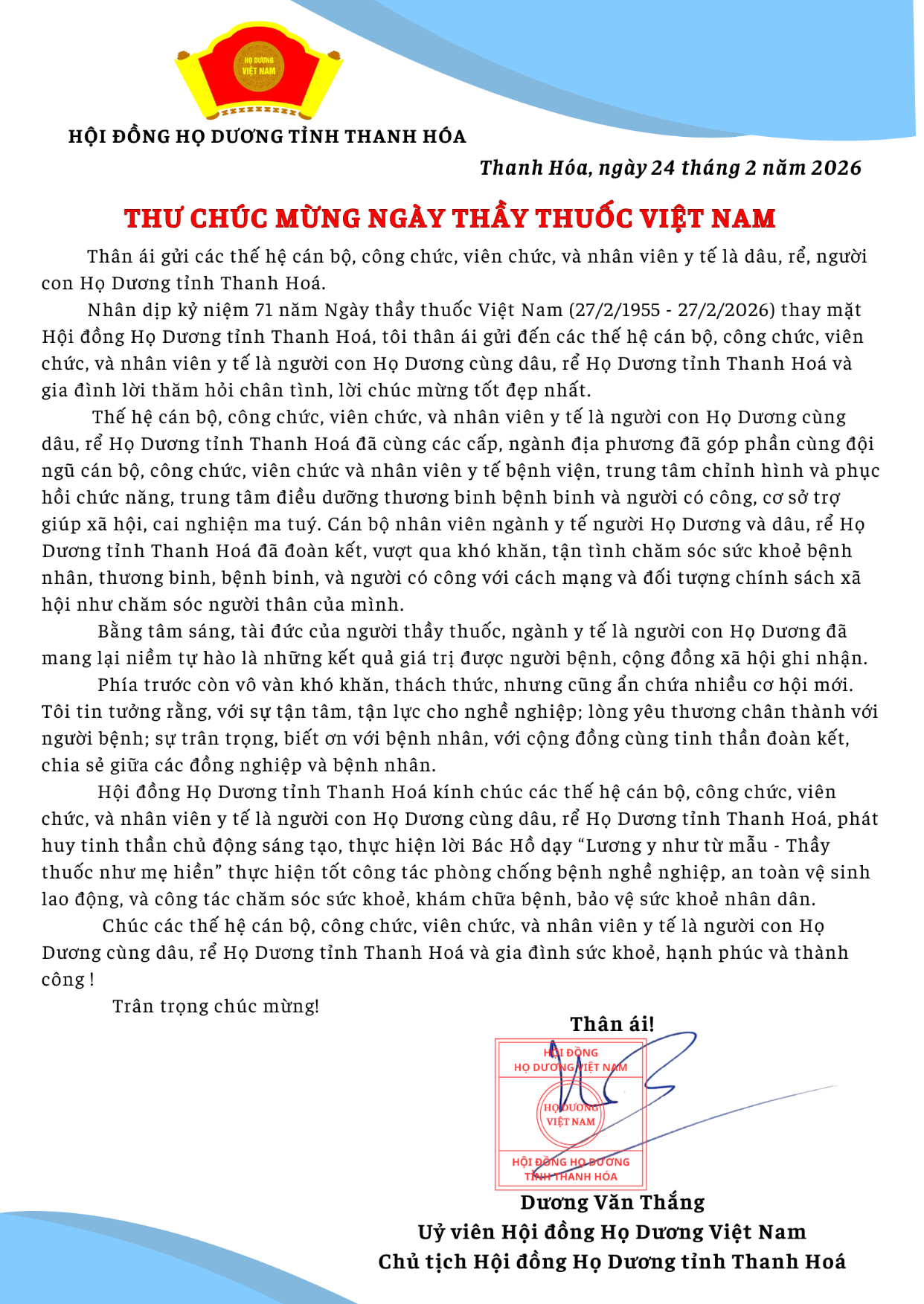 Nhân dịp kỷ niệm 71 năm Ngày thầy thuốc Việt Nam (27/21955 – 27/2/2026), thay mặt Hội đồng Họ Dương tỉnh Thanh Hoá, ông Dương Văn Thắng – Uỷ viên Hội đồng Họ Dương Việt Nam – Chủ tịch Hội đồng Họ Dương tỉnh Thanh Hoá gửi thư chúc mừng đến các thế hệ cán bộ, công chức, viên chức, và nhân viên y tế là dâu, rể, người con Họ Dương tỉnh Thanh Hoá.